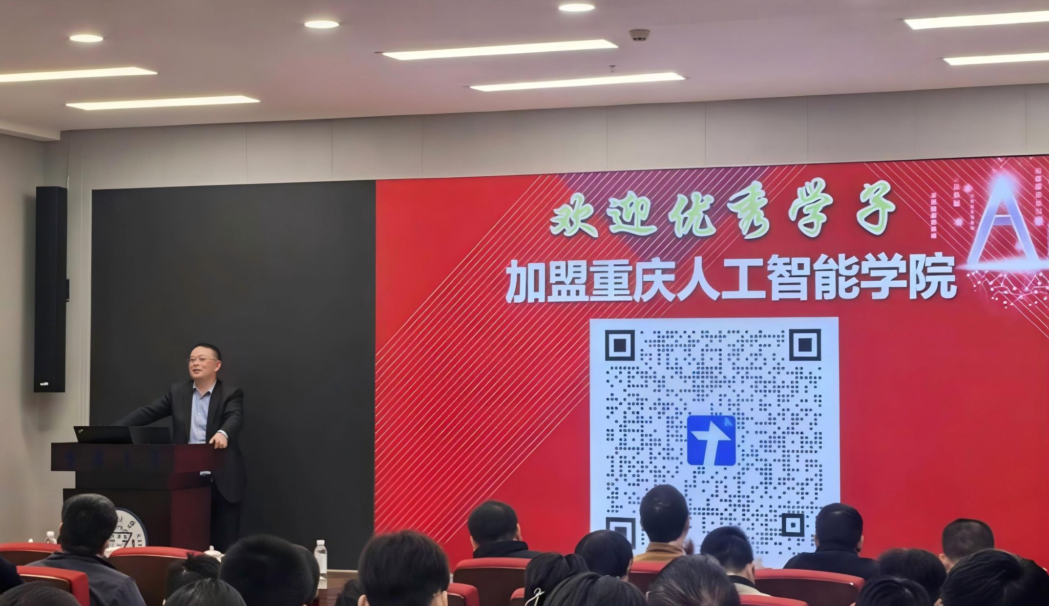 宣讲会伊始,重庆大学信息学部副主任朱涛教授致辞。他指出,人工智能作为第四次工业革命的核心驱动力,正深刻重塑全球科技版图与产业格局。他高度肯定重庆人工智能学院“扎根西部、智领未来”的使命担当,并鼓励青年学子主动拥抱时代变革,积极投身人工智能领域的创新实践。