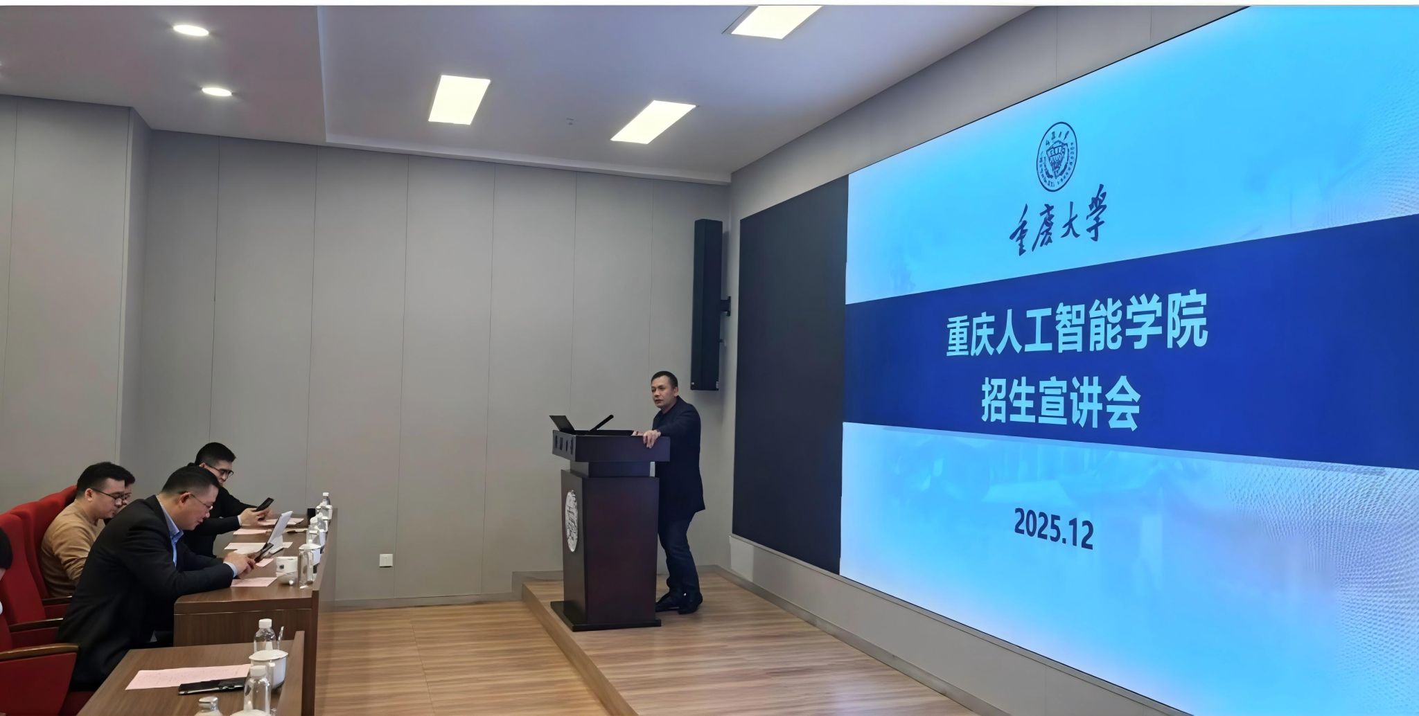 2025年12月19日上午,重庆人工智能学院招生宣讲会在重庆大学虎溪校区信息技术科研楼A623报告厅顺利举行。重庆人工智能学院执行院长宋国杰研究员、人才培养部部长王进教授、重庆市教育委员会学位管理与研究生教育处处长张永祥教授、重庆大学信息学部副主任朱涛教授等出席活动。重庆大学信息学部下属光电工程、通信工程、自动化、计算机科学与技术、软件工程五个学院的研究生分管领导及130余名本硕学生到场参会,会议由重庆大学研究生院副院长张亮教授主持。