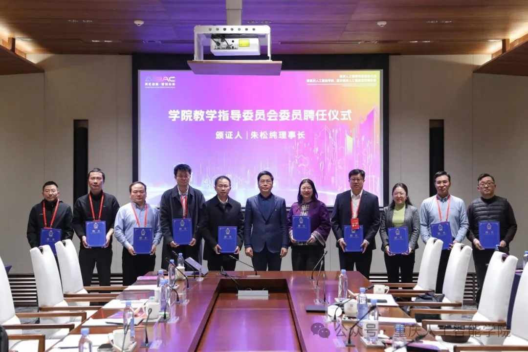会上举行了重庆人工智能学院教学指导委员会成员聘任仪式。朱松纯为委员颁发聘书,聘任宋国杰、韩军伟、郑卿等十位业内专家学者为委员会主任成员。